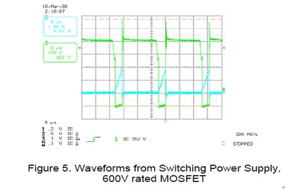 但這里必須提醒一件事 , 圖四所標(biāo)示的 BVDSS 是基于 250uA 的 ID 電流為條件所定義。在實(shí)際崩潰發(fā)生時(shí) ID 電流遠(yuǎn)大于 uA 的范圍。 因此 , 所欲達(dá)到的崩潰電壓也會(huì)比上述圖四中所推導(dǎo)的電壓要來的大的多。就實(shí)際的考量而言 , 場(chǎng)效應(yīng)晶體管的實(shí)際崩潰電壓一般是額定低電流崩潰電壓的 1.3 倍。以圖五為例 , 它所表示的是一個(gè)超過最大額定電壓但并未進(jìn)入崩潰現(xiàn)象的波形 ,Drain-Source 的電壓已達(dá)到 668V > 600V 但并未嵌制于崩潰效應(yīng)。