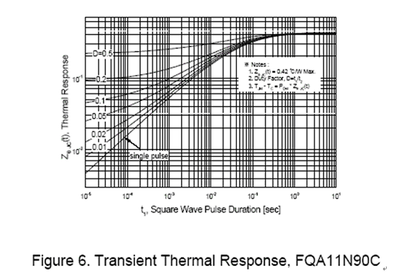 舉例說明 , 當(dāng)一個(gè) 2KW 的電源脈沖加至 FQA11N90 的脈沖時(shí)間為 1uS 時(shí) , 我們可依據(jù)圖六的曲線算出此脈沖功率對(duì)接合面所產(chǎn)生的溫升為