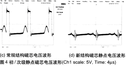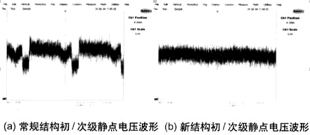 測(cè)量變壓器初級(jí)和次級(jí)靜點(diǎn)的電壓波形及變壓器磁芯的電壓波形,可以為EMI的傳導(dǎo)測(cè)試提供一些參考(見圖4)。常規(guī)結(jié)構(gòu)變壓器的初級(jí)和次級(jí)靜點(diǎn)電壓波形的幅值為10V,并且可以明顯地看到基于開關(guān)頻率的開關(guān)波形。新結(jié)構(gòu)變壓器的初級(jí)和次級(jí)靜點(diǎn)電壓波形的幅值為5V,基于開關(guān)頻率的開關(guān)波形不是很明顯。常規(guī)結(jié)構(gòu)的變壓器的磁芯電壓波形的幅值為18V,可以明顯地看到基于開關(guān)頻率的開關(guān)波形。新結(jié)構(gòu)的變壓器的磁芯電壓波形的幅值為5V,基于開關(guān)頻率的開關(guān)波形不是很明顯。