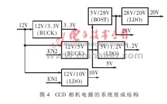 CCD 相機(jī)中的圖像信息的流動和變換是通過相機(jī)中的FPGA/CPLD時序發(fā)生器的驅(qū)動和MCU的控制管理下完成的。整個CCD相機(jī)正常工作需要以下6種穩(wěn)壓電源,它們的電壓值和最大輸出電流分別是:28V@30mA、20V@50mA、10V@100mA、5V@20mA、3.3V@300mA和1.2V@30mA。