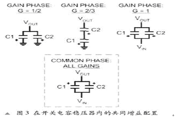 開關(guān)電容穩(wěn)壓器的更多增益可能會(huì)增加一點(diǎn)點(diǎn)效率,但是卻要增加更多外部電容器和內(nèi)部功率FET,從而增加成本,同時(shí)也加大了解決方案的尺寸。上述的增益可以通過兩個(gè)外部電容器或快速電容器(CFLY)來取得。這些電容器用于存儲(chǔ)電荷并將電荷從VIN 傳輸?shù)?VOUT。除了快速電容(CFLY) ,我們還需要一個(gè)輸入電容器(CIN),和一個(gè)輸出電容器(COUT),輸入電容器(CIN)指示出電壓紋波,而輸出電容器(COUT)控制輸出電壓紋波。根據(jù)VIN 和 VOUT 可接受的紋波取值,CIN 和COUT 的典型值范圍是從1mF 到10mF 。CFLY 的數(shù)量通常比COUT 少。外部電容器(CFLY)通過內(nèi)部的功率FET在不同的配置中連接到芯片。圖3顯示出2/3, 1/2和1增益的不同配置。電容器C1和C2是快速電容器或CFLY。CIN和COUT已被刪除以達(dá)到簡(jiǎn)化目的。如圖所示,一個(gè)增益通過兩相位間的交替變化來取得,其中包括充電相位或普通相位和放電相位。在不同的增益之間具有一個(gè)共同相位以便在增益間達(dá)到完美躍遷。我們可以通過共同相位,根據(jù)需要隨時(shí)進(jìn)行增益躍遷。一個(gè)開關(guān)電容穩(wěn)壓器在芯片上可能有一個(gè)到2個(gè)功率FET。然而,一個(gè)開關(guān)電容穩(wěn)壓器可能在芯片上任何位置設(shè)有4個(gè)到9個(gè)或者更多的功率FET(根據(jù)離散電壓增益的數(shù)量)。這就限制了在既定的裸片尺寸下,開關(guān)電容穩(wěn)壓器的輸出電流性能。圖4在開關(guān)、開關(guān)電容器和線性穩(wěn)壓器間的負(fù)載性能、效率和尺寸上進(jìn)行了比較。
