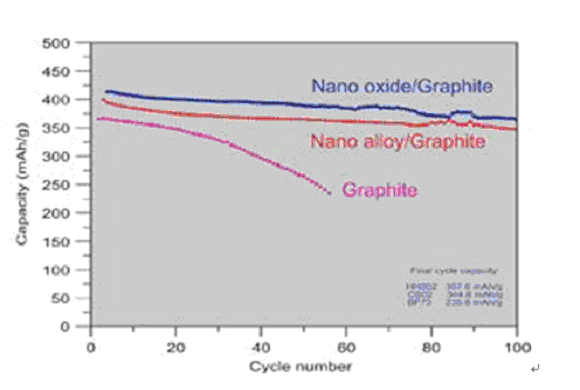 目前商品化的鋰電池負(fù)極材料,主要種類包括石墨化碳、人工石墨、硬碳及碳纖維等。其中石墨化碳(如介穩(wěn)定相碳狀碳)的市場佔(zhàn)有率最高約30%,其材料價格高(每公斤30~32美金)、容量適中、壽命佳,目前被大量使用于鋰電池負(fù)極材料;然而其容量已達(dá)技術(shù)極限,非得使用更高容量的石墨碳材或合金材料,才能獲得高能量密度的鋰電池。目前高容量負(fù)極材料的開發(fā),主要包括利用高能量機(jī)械合金化研磨(high-energy mechanical alloying) 技術(shù),將金屬或合金材料進(jìn)行高能量研磨,以獲得納米結(jié)構(gòu)金屬或合金材料;或?qū)⑻挤郾砻驽兩弦粚蛹{米氧化物及合金材料,以形成納米復(fù)合負(fù)極材料,如(圖三)。