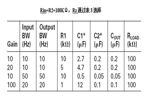 設(shè)計單電源運算放大器電路,需要考慮輸入偏置電流誤差、電源抑制、增益、以及輸入與輸出線路帶寬等等。然而普通的應用設(shè)計是可以通過查表來獲得,見表1。在單電源電壓為15V或12V時偏置分壓的兩個電阻通常選用100kΩ,這樣可以在電源消耗與輸入偏置電流誤差之間合理的折中。5V單電源偏置分壓電阻減小到一個比較低的值,例如42kΩ。還有些在3.3V應用中偏置分壓電阻選在27kΩ左右。