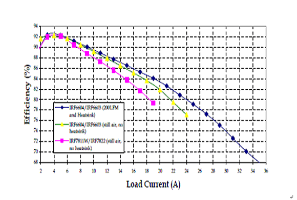 在一個(gè)12V輸入,1.3V輸出,工作頻率300kHZ的同步降壓變換器中,我們將IRF6603/IRF6604和IRF7822/IRF7811W這兩對(duì)管子做以比較,它們使用的硅片技術(shù)是相同的。負(fù)載電流增加時(shí),此變換器電路板的溫度不得超過105°C。當(dāng)電流達(dá)到18A時(shí),這是SO8封裝在無冷卻氣流的條件下能夠承受的大電流,IRF6603的結(jié)溫要低50°C。比較DirectFET和SO-8在靜止空氣無散熱器條件下的效率曲線,在18A時(shí)前者的效率要高出3%。