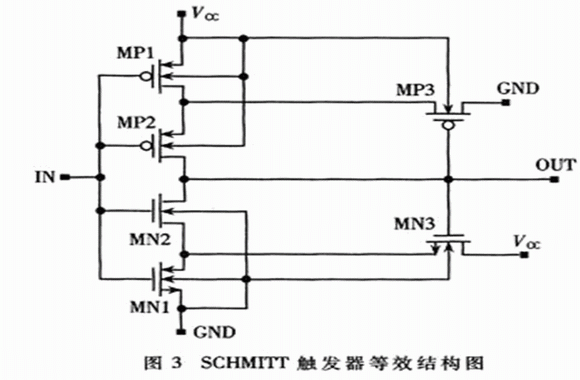改進(jìn)的電路如圖2所示,電路結(jié)構(gòu)由采樣、先導(dǎo)控制、比較器、遲滯反饋回路、加速響應(yīng)電路、緩沖器六部分構(gòu)成。電阻R1、R2、R3、R4構(gòu)成分壓電阻網(wǎng)絡(luò)實(shí)現(xiàn)對(duì)Vcc的采樣;MNl、R5、INVl組成先導(dǎo)控制電路,實(shí)現(xiàn)對(duì)比較器灌電流的控制;MN2、R6、MP2組成比較器,實(shí)現(xiàn)采樣電壓與MN2的VTH比較;MP1構(gòu)成正反饋回路,可實(shí)現(xiàn)Vcc的遲滯功能;INV2、MP3、R7構(gòu)成正反饋回路,可加速比較器的翻轉(zhuǎn),從而提高電路的響應(yīng)速度;SCHMITT觸發(fā)器和INV3是緩沖電路,對(duì)比較器的輸出波形進(jìn)行緩沖和整形,SCHMITT觸發(fā)器的結(jié)構(gòu)如圖3所示,其工作原理詳見參考文獻(xiàn)[3];另外,電容C1起濾波和儲(chǔ)能作用。