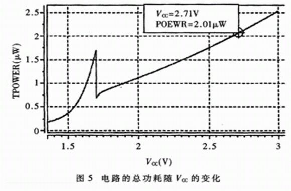 從圖5的仿真波形中可以看出:當(dāng)Vcc的電壓正常時(shí),電路的總功耗隨著Vcc的升高而增大,當(dāng)Vcc=2.7V時(shí),總功耗約為2μW,可見電路的靜態(tài)功耗很低。