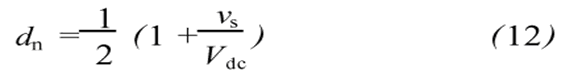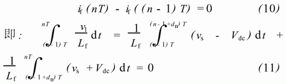 單相電壓源型有源濾波器直流側(cè)以電容作為儲能元件來維持直流電壓Vdc恒定。設(shè)開關(guān)周期恒定為T,第n個開關(guān)周期內(nèi)占空比為dn,則這個開關(guān)周期內(nèi)兩對開關(guān)管分別導(dǎo)通的時間為dn*T和(1-dn)*T,從而分別可以得到兩個電壓平衡方程: