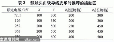 單柱垂直斷口隔離開關(guān),因其靜觸頭懸掛在母線上,為了適應風力、溫度和冰雪的影響,確保隔離開關(guān)能可靠合閘,GB1985對接觸區(qū)(也稱鉗夾范圍)提出了推薦值,如表3、表4。在進行變電站設(shè)計和選用隔離開關(guān)時,應考慮到具體運行條件,確保靜觸頭處在規(guī)定的接觸區(qū)限值之內(nèi),使隔離開關(guān)能正確地分合閘。