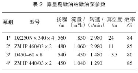 秦皇島輸油站輸油設(shè)備如表2、表3所列。秦皇島輸油站配備4臺輸油泵機(jī)組,并聯(lián)方式,直接抽10萬m3油罐外輸,且只能一臺泵機(jī)組運(yùn)行。其中1#泵機(jī)組配有液力耦合器調(diào)速裝置,其它3臺均無調(diào)速裝置。冀東原油混入后,出現(xiàn)1#、2#、4#泵機(jī)組配置明顯偏大,而3#泵機(jī)組配置又有所偏低的狀況,致使輸油站外輸量降低。目前運(yùn)行中以帶液力耦合器的1#輸油泵機(jī)作為主力,該泵機(jī)組為上世紀(jì)90年代初期國產(chǎn)產(chǎn)品,效率低,故障率高;而于2003 年與2004年相繼更換的2#、4#泵機(jī)組(進(jìn)口設(shè)備)因揚(yáng)程、排量過大,目前基本處于閑置狀態(tài)。