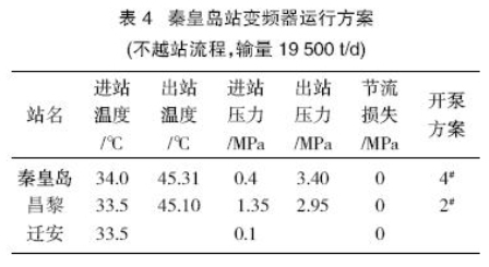 秦皇島站運(yùn)行4#輸油泵節(jié)流損失0.80 MPa,運(yùn)行2#輸油泵節(jié)流損失1.2 MPa,浪費很多電能,并且運(yùn)行中這兩臺泵的震動很大。綜合考慮(冀東油田來油量逐年遞增,秦皇島外輸量逐年遞減,輸量不穩(wěn)定)通過采用更換或切削泵葉輪的方案解決該站節(jié)流損失的方案不可取,應(yīng)考慮在秦皇島站增加調(diào)速裝置,調(diào)節(jié)揚(yáng)程及輸量。故采用了表4所列的變頻器運(yùn)行方案。
