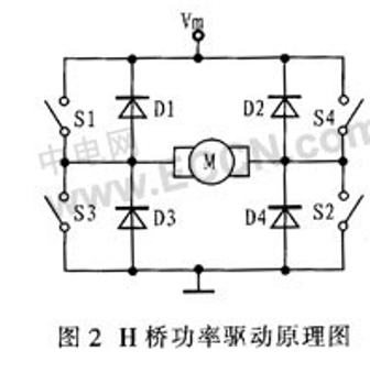 直流電機驅動使用最廣泛的就是H型全橋式電路,這種驅動電路方便地實現(xiàn)直流電機的四象限運行,分別對應正轉、正轉制動、反轉、反轉制動。H橋功率驅動原理圖如圖2所示。