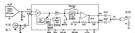 如果系統(tǒng)設計中已經采用了THS7303或THS7313 6dB增益放大器,并采用了參考接地的DAC或編碼器驅動,那么DC輸入模式會很理想。問題在于,DAC生成的電壓有多低?如果同步信號(通常這是視頻信號中電壓最低的)電壓低于50mV,那么6dB放大器的輸出就應生成低于100mV的電壓,由于CMOS和雙極放大器都存在晶體管飽和方面的限制,因此這對任何放大器來說都是很難做到的。