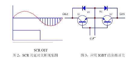 旁路開關常使用繼電器和可控硅。繼電器在中小功率的UPS 中廣泛應用。優(yōu)點是控制簡單,成本低,缺點是繼電器有轉(zhuǎn)換時間,還有就是機電器件的壽命問題??煽毓璩R娪谥写蠊β蔝PS 中。優(yōu)點是控制電流大,沒有切換時間。但缺點就是控制復雜,且由于可控硅的觸發(fā)工作特性,在觸發(fā)導通后要在反向偏置后才能關斷,這樣就會產(chǎn)生一個最大10ms 的環(huán)流電流,如圖2。如果采用IGBT,如圖3,則可以避免這個問題,使用IGBT 有控制簡單的優(yōu)點,但成本較高。其工作原理為:當輸入為正半周時,電流流經(jīng)Q1、D2,負半周時電流流經(jīng)D1、Q2。