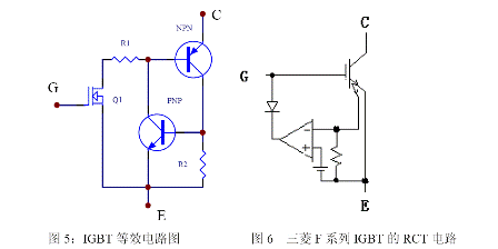 IGBT 有一定抗過電流能力,但必須注意防止過電流損壞。IGBT 復合器件內(nèi)有一個寄生晶閘管,所以有擎住效應。圖5 為一個IGBT 的等效電路,在規(guī)定的漏極電流范圍內(nèi),NPN 的正偏壓不足以使NPN 晶體管導通,當漏極電流大到一定程度時,這個正偏壓足以使NPN 晶體管開通,進而使NPN 和PNP 晶體管處于飽和狀態(tài),于是寄生晶閘管開通,門極失去了控制作用,便發(fā)生了擎住效應。IGBT 發(fā)生擎住效應后,漏極電流過大造成了過高的功耗,最后導致器件的損壞。