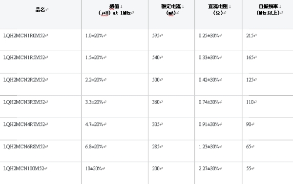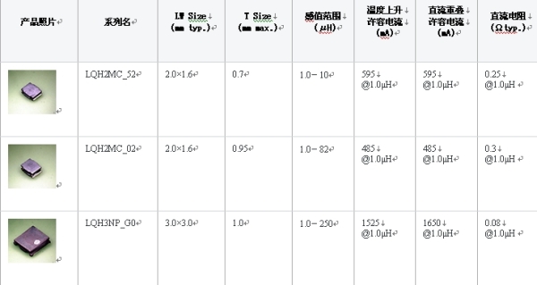 表1:功率電感LQH系列產(chǎn)品線一覽