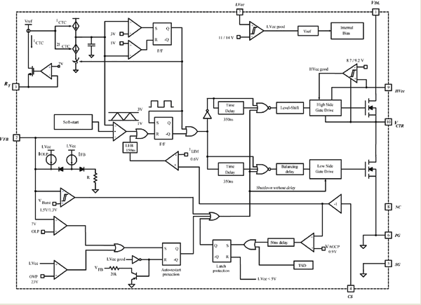 飛兆半導(dǎo)體的集成式“Green FPS”功率開關(guān)FSFA2100系列是專門針對(duì)不對(duì)稱半橋轉(zhuǎn)換器設(shè)計(jì)而開發(fā)的一種技術(shù)。這種技術(shù)在單個(gè)器件中整合了PWM控制器、高端驅(qū)動(dòng)和SuperFET,只需要極少數(shù)量的外部元件。圖3所示為其內(nèi)部模塊示意圖。在大功率轉(zhuǎn)換器應(yīng)用中,PCB版圖設(shè)計(jì)一向是棘手部分,因?yàn)樵诓季謺r(shí),為了把噪聲干擾降至最低,必需讓柵極驅(qū)動(dòng)器和控制電路盡可能地靠近MOSFET。FSFA2100把柵極驅(qū)動(dòng)器及控制電路與MOSFET集成在一起,使這些器件之間的距離最小化,從而大幅減小了終端應(yīng)用的噪聲干擾。此外,這樣做也減少了寶貴的設(shè)計(jì)時(shí)間,使生產(chǎn)力得以提高。