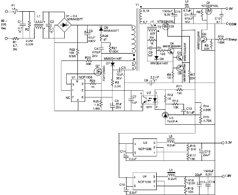 本文介紹的參考設(shè)計采用通用交流輸入,提供5.0 V、3.3 V和1.8 V輸出,能效高于72%。只要簡單改變3.3 V和1.8 V輸出上的檢測網(wǎng)絡(luò),也可以提供其它輸出電壓。如果需要“休眠模式”的話,該設(shè)計也提供抑制5 V輸出的選項。此電源的主轉(zhuǎn)換器使用安森美半導(dǎo)體的NCP1308電流模式控制器及1個外部MOSFET,采用準諧振(QR)反激拓撲結(jié)構(gòu)設(shè)計。5 V輸出采用1個同步整流MOSFET,而2個較低電壓輸出轉(zhuǎn)換器采用工作在1 MHz頻率的NCP1595單片同步降壓穩(wěn)壓器來實現(xiàn)。5 V輸出還充當(dāng)2個降壓穩(wěn)壓器的直流源。這種特別的元件組合提供了一種簡單但有效的三輸出開關(guān)穩(wěn)壓器,根據(jù)輸出電壓和電流組合及相應(yīng)系統(tǒng)總能效的不同,提供近6 W的有效功率輸出。此設(shè)計除了具有輸入傳導(dǎo)EMI濾波器,還增加了過流保護(OCP)和過壓保護(OVP)等典型保護功能。