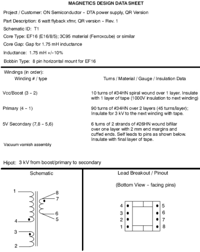 電流感測變壓器T2的設(shè)計并非最關(guān)鍵的事項,可以采用任何匝數(shù)比在30:1至50:1的小型鐵芯就可以使用。然而,主反激變壓器T1的設(shè)計對能效及優(yōu)化電源性能而言非常關(guān)鍵。我們并不建議重新設(shè)計磁芯結(jié)構(gòu)更小(磁芯橫截面積Ae更小)的變壓器。使用橫截面積較大的磁芯可能使總匝數(shù)較少,并有可能增量提升能效,但為了恰當(dāng)?shù)碾娐饭ぷ鳎枰S持規(guī)定的電感值。