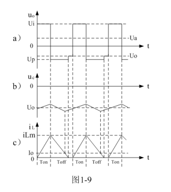 圖1-7中,Ui為輸入電源,K為控制開關,L為儲能電感,D為整流二極管,C為儲能濾波電容,R為負載電阻。當控制開關K接通的時候,輸入電源Ui開始對儲能電感L加電,流過儲能電感L的電流開始增加,同時電流在儲能電感中也要產(chǎn)生磁場;當控制開關K由接通轉為關斷的時候,儲能電感會產(chǎn)生反電動勢,使電流繼續(xù)流動,并通過整流二極管D進行整流,再經(jīng)電容儲能濾波,然后向負載R提供電流輸出??刂崎_關K不斷地反復接通和關斷過程,在負載R上就可以得到一個負極性的電壓輸出。