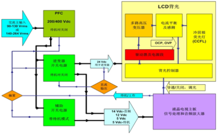 圖1:采用標(biāo)準(zhǔn)直流24 V逆變器的傳統(tǒng)液晶電視開關(guān)電源框圖。