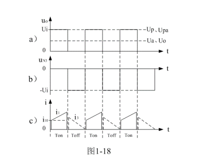 圖1-17中,在Ton期間,控制開關(guān)K接通,輸入電源Ui對變壓器初級線圈N1繞組加電,初級線圈N1繞組有電流i1流過,在N1兩端產(chǎn)生自感電動勢的同時,在變壓器次級線圈N2繞組的兩端也同時產(chǎn)生感應(yīng)電動勢,并向負(fù)載提供輸出電壓。開關(guān)變壓器次級線圈輸出電壓大小由(1-63)、(1-69)、(1-76)、(1-77)等式給出,電壓輸出波形如圖1-18-a)。