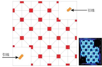AC LED光源的重大技術(shù)突破是超細(xì)LED晶粒在封裝時(shí)的特殊排列組合技術(shù),同時(shí)利用LED PN結(jié)的二極管特性兼作整流,半導(dǎo)體制程在其中扮演著相當(dāng)重要的角色。AC LED通過(guò)半導(dǎo)體制程整合成一堆微小晶粒,采用交錯(cuò)的矩陣式排列工藝,并加入橋式電路至芯片設(shè)計(jì),使AC電流可雙向?qū)ǎ瑢?shí)現(xiàn)發(fā)光。晶粒的排列如圖2所示,左圖是AC LED晶粒采用交錯(cuò)的矩陣式排列示意圖,右小圖是實(shí)際AC LED晶粒排列照片,AC LED晶粒在接上交流后通體發(fā)光,因此只需要二根引線(xiàn)導(dǎo)入交流源即能發(fā)光工作。