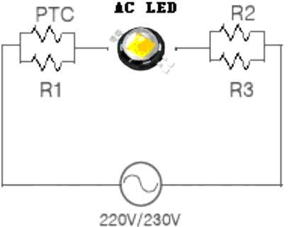 AC LED的典型應(yīng)用電原理圖如圖6所示十分簡(jiǎn)單,在AC LED兩端分別串入正溫度系數(shù)熱敏電阻PTC,和限流電阻R1、R2、R3,接上110V或220V交流即可進(jìn)入照明工作。