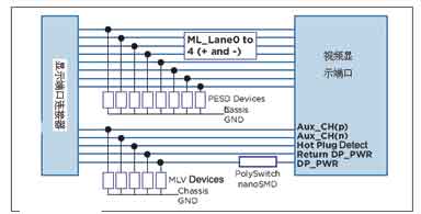圖11是一種典型的顯示端口保護電路。2.7GHz的高頻信號線采用8個PESD保護元件,輔助通道工作頻率為1MHz,采用5個MLV保護元件;在低壓直流電源中則采用了PolySwitchTM元件作過流保護。這樣的設(shè)計既滿足電路能耗要求,并且降低了成本。