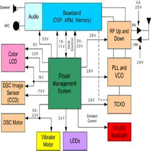 不同的智能型手機零件有著不同的電源需求,(圖二)是行動電話中需要電源的主要零件簡單方塊圖,例如射頻單元的壓控振蕩器(VCO)以及鎖相回路(PLL)就需要極低噪聲和很高電源拒斥比的電源,確保它們提供最高的傳送和接收效能,因此雖然線性穩(wěn)壓器的效率不高,但由于它沒有輸出漣波,所以是這類電源供應(yīng)的最佳選擇;同樣重要的是將直流轉(zhuǎn)換器的開關(guān)頻率,還有它們的二階和三階諧波,都保持在中頻頻帶之外。