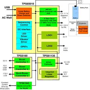 在此解決方案中,3.3VI/O電源是由SEPIC轉(zhuǎn)換器提供,它讓應(yīng)用系統(tǒng)能充份利用鋰離子電池電力,直到電池電壓降至最低水平(大約2.7V)。和離散解決方案一樣,穩(wěn)壓器輸出也來自3.3V輸入電源,以便提高工作效率。TPS65010采用48只接腳QFN封裝,這些組件都內(nèi)建FET晶體管。TPS61130SEPIC轉(zhuǎn)換器采用4×4平方厘米QFN封裝,并且內(nèi)建FET晶體管,最高達到90%以上效率,TPS5100則是三通道輸出控制器,專門用來提供電源給顯示器。功率放大器和中央處理器電源使用的動態(tài)電壓調(diào)整技術(shù)可以改善每顆零件的效率,進而協(xié)助降低功耗。