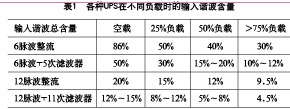 為了提高輸入指標(biāo),還可以采用12脈波整流器和輸入濾波器。但這些將增加尺寸、重量和成本,并降低整體效率。在滿載時(shí)輸入指標(biāo)可以達(dá)到THD<5%,PF>0.95,但在半載或更低負(fù)載時(shí)輸入指標(biāo)將嚴(yán)重惡化。各種UPS在不同負(fù)載時(shí)的輸入諧波含量如表1所示。