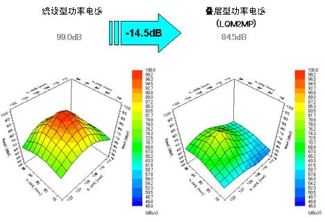 圖6顯示了繞線型功率電感和疊層型功率電感的磁束泄漏監(jiān)測(cè)數(shù)據(jù)。與一直以來作為DC-DC轉(zhuǎn)換器上使用的主要功率電感的繞線型功率電感相比,疊層型功率電感的磁束泄漏更少,現(xiàn)已證實(shí)閉合磁路的構(gòu)造使磁束泄漏較少。這些數(shù)據(jù)表明在小型高速開關(guān)DC-DC轉(zhuǎn)換器電路中使用小型疊層型功率電感的情況下,能夠發(fā)揮它抗噪特性的特長(zhǎng)。