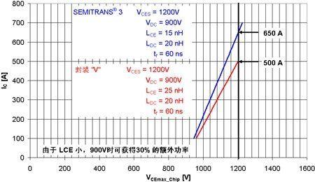 當使用低電感模塊時,可以實現(xiàn)高可靠性和最高效率。圖3顯示SEMITRANS®3和與其作對比的不同形狀封裝“C”之間的差異。由于模塊的電感小,SEMITRANS®3在芯片的最大反向電壓達到之前可切換的電流值要高30%。受益于主端子加上用于DCB的對稱并聯(lián)設計,SEMITRANS®模塊可實現(xiàn)低電感(請注意,依托模塊電感,半導體芯片上實際產(chǎn)生的電壓永遠高于端子上產(chǎn)生電壓)。
