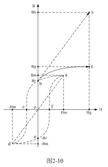 但當變壓器鐵芯中的磁化過程是從上次剩余磁通密度Br的位置開始時,上面所分析的理想磁化過程將要被破壞,磁通密度B不會再沿著理想磁化曲線d-a進行,而是沿著另一條新的等效磁化曲線進行;這條新的等效磁化曲線應該與原理想磁化曲線d-a平行,并且經(jīng)過Br點,圖2-10中虛線b-h就是這條新的等效磁化曲線的一部分。這里只畫出新等效磁化曲線的一半,另一半在圖2-10中沒有畫出。