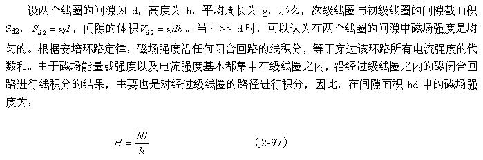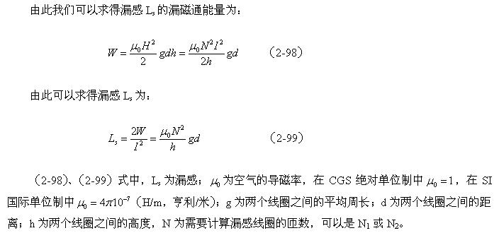 如果我們拿(2-99)式與(2-67)式或(2-94)式進(jìn)行對(duì)比,可以看出,線圈漏感與線圈的電感是沒有本質(zhì)區(qū)別的,只是磁路和磁通密度以及介質(zhì)導(dǎo)磁率等參數(shù)需要根據(jù)實(shí)際情況來決定。