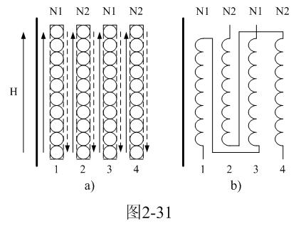 在圖2-31中,兩個(gè)線圈之間實(shí)線箭頭表示正磁通的方向,虛線表示反磁通的方向。從圖中可以看出,多層線圈間隙與間隙之間的正、反向磁通是可以部分抵消的,因此,變壓器線圈的漏感可以減小。