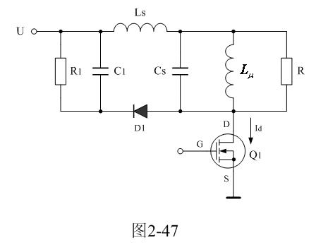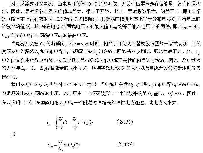 在圖2-46中,Cs1、Cs2都是分布電容,它們對(duì)于漏感 來(lái)說(shuō),既可以產(chǎn)生串聯(lián)振蕩,又可以產(chǎn)生并聯(lián)振蕩。在電源開(kāi)關(guān)管Q1導(dǎo)通瞬間,漏感與分布電容主要是產(chǎn)生串聯(lián)振蕩,因?yàn)檩斎腚妷洪_(kāi)始向串聯(lián)振蕩回路提供能量;在電源開(kāi)關(guān)管Q1關(guān)斷瞬間,漏感與分布電容主要是產(chǎn)生并聯(lián)振蕩,因?yàn)槁└?必須要通過(guò)并聯(lián)回路釋放能量。在實(shí)際應(yīng)用中,漏感相對(duì)于勵(lì)磁電感 來(lái)說(shuō)很小,因此如果不考慮漏感的作用,完全可以把Cs1、Cs2看成是一個(gè)分布電容。