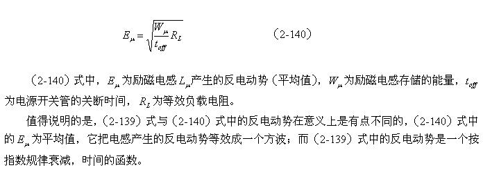 (2-140)式對(duì)于計(jì)算漏感 產(chǎn)生的反電動(dòng)勢(shì)或其它電感產(chǎn)生的反電動(dòng)勢(shì)同樣有效。漏感 中存儲(chǔ)的能量可根據(jù)(2-138)式求得;而流過(guò)漏感 的電流,對(duì)于反激式開(kāi)關(guān)電源:可認(rèn)為與勵(lì)磁電流的大小基本相等,因?yàn)?,在反激式開(kāi)關(guān)電源中,等效負(fù)載電阻等于無(wú)限大;對(duì)于正激式開(kāi)關(guān)電源:可認(rèn)為與流過(guò)等效負(fù)載電阻的電流大小基本相等,因?yàn)?,在正激式開(kāi)關(guān)電源中,勵(lì)磁電流相對(duì)于流過(guò)等效負(fù)載電阻的電流,很小。