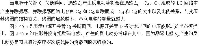 圖2-47中的D1、R1、C1是抑制漏感以及勵(lì)磁電感產(chǎn)生反電動(dòng)勢(shì)和振鈴電壓幅度的有效電路。當(dāng)變壓器初級(jí)漏感以及勵(lì)磁電感產(chǎn)生反電動(dòng)勢(shì)時(shí),反電動(dòng)勢(shì)通過(guò)二極管D1對(duì)電容器C1進(jìn)行充電,相當(dāng)于電容器把反電動(dòng)勢(shì)的能量吸收掉,從而降低了反電動(dòng)勢(shì)和振鈴電壓的幅度。