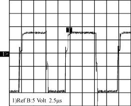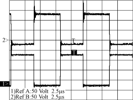 開(kāi)關(guān)管S1和S的Uds波形如圖3所示,RefA為S管壓降波形,50V/div,RefB為S1管壓降波形,50V/div。電路此時(shí)工作在Vin=60V左右,S1和S的開(kāi)關(guān)應(yīng)力大概為120V,D=0.5左右。圖4為變壓器輸出電壓,也就是同步整流管SR1和SR的驅(qū)動(dòng)信號(hào),正的部分為SR的驅(qū)動(dòng)信號(hào),負(fù)的部分為SR1的驅(qū)動(dòng)信號(hào)。實(shí)驗(yàn)所得波形和分析的波形基本吻合,只是在開(kāi)關(guān)轉(zhuǎn)換瞬間,電壓有小尖峰,這是由電路的雜散參數(shù)引起的。該電路的工作效率經(jīng)過(guò)測(cè)量大約在90%左右,基本達(dá)到設(shè)計(jì)的要求。