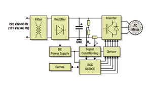 如圖1所示,完整的調(diào)速驅(qū)動(dòng)系統(tǒng)包括EMI濾波器、輸入整流器、直流供電、DSC(數(shù)字信號(hào)控制器)、信號(hào)調(diào)理電路,供電變極器,以及門控驅(qū)動(dòng)器等。