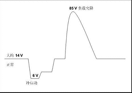 如12V電池電源線的電壓瞬變范圍(VIN)非常寬廣,小至6V,,大至87V。典型的車載電力系統(tǒng)的工作電壓范圍往往只有在9V~16V。引擎關(guān)閉時(shí)電池的正常額定電壓為12V,啟動(dòng)時(shí)為14.4V。但是,這個(gè)范圍在瞬變狀態(tài)時(shí)很容易擴(kuò)大到80V峰值以上。