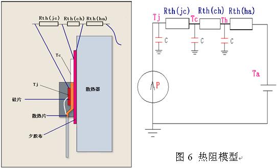 圖5為TO-220典型的安裝結(jié)構(gòu)及熱模型。熱阻與電阻相似,所以我們可以將Rth(ja)看著幾個(gè)小的電阻串聯(lián),從而有如下公式:
