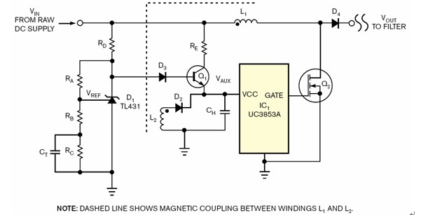 這個(gè)電路如同圖1所示,其中的二極管D2和輔助線圈L2會(huì)提供正常操作電源給IC1。