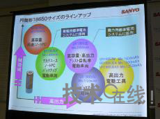 圖4:三洋電機移動能源公司業(yè)務開發(fā)統(tǒng)括部統(tǒng)括部長雨堤徹 圖5:通用圓筒形單元(18650)的產(chǎn)品陣容。根據(jù)用途區(qū)分使用