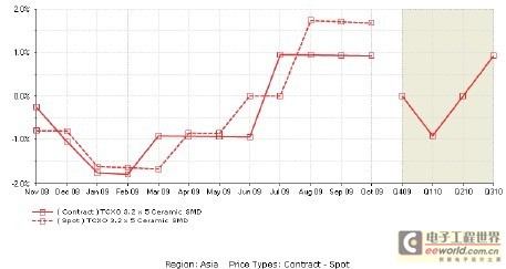 10月份振蕩器的平均現(xiàn)貨市場價格是1.42美元,合同價格是1.17美元。有一些跡象表明2010年第一季度需求將放緩,而供應(yīng)將會改善。這種趨勢可能使該市場恢復(fù)供需平衡。第四季度振蕩器的合同價格預(yù)計將持穩(wěn),2010年第一季度下降0.2%。