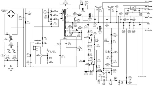 ±15VDC和+5VDC輔助輸出從線性穩(wěn)壓器獲得。為了限制線性穩(wěn)壓器(5V和15V)中的功率耗散,向變壓器T1另外添加了一個18V輸出。