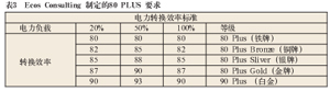美國(guó)能源之星對(duì)電源有載、空載工作模式下的工作效率和EcosConsulting制定的80Plus有關(guān)工作效率要求分別如表1、表2和表3所示。