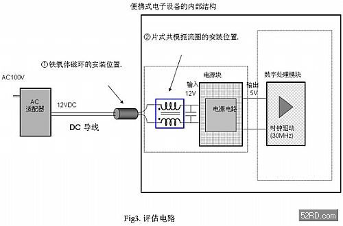 根據(jù)評估結(jié)果的測試數(shù)據(jù),噪聲的發(fā)射范圍從幾十MHz到800MHz都有。因此,可以推斷噪聲是從DC/DC轉(zhuǎn)換器和內(nèi)部數(shù)字處理電路傳向AC適配器,通過電源線發(fā)射出來的。