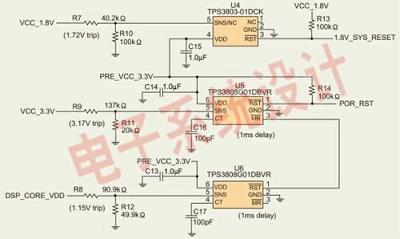 圖2是復(fù)位電路。該電路采用TPS3808和TPS3803電源電壓監(jiān)控器來監(jiān)控電壓軌的變化情況。請采用最小值的TPS3808G01(U5)來設(shè)計(jì)復(fù)位電路電源。如果需要大于3.3V電壓軌/1.5A電流和1.2V電壓軌/1.2A電流,那么TPS54350和TPS54110SWIFTDC/DC轉(zhuǎn)換器可能會被分別用于實(shí)現(xiàn)3A和1.5A電流。SWIFT穩(wěn)壓器具有基于DaVinci技術(shù)的數(shù)字視頻EVM的特點(diǎn)。如欲了解更多采用了線性調(diào)節(jié)器、TPS40KDC/DC轉(zhuǎn)換器、TPS62xxxDC/DC轉(zhuǎn)換器或多輸出電源管理單元(PMU)的5V和12V輸入電源